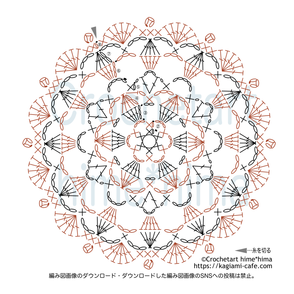 2025.10.22 かぎ針編みのドイリー PR サン・ブロッサムドイリー(#doily_036) hime*hima 記事内に商品プロモーションを含む場合があります hime*hima このドイリーの名前、ChatGPTに考えてもらいました!ちょっとこれまでとは違う名前の感じ・・・だけど、AIで作品の名前付けが楽になりそうです! 編んでみると、しっかりした仕上がりになるので、コースターとして使いやすいものができると思います👍 目次 使用針・糸・サイズドイリーの編み図(糸の色を変えて編む場合の編み図)ドイリーの編み図(1色の糸で編む場合の編み図)編み方スポンサーリンク 使用針・糸・サイズ 使用針:かぎ針 2/0号 使用糸: 黄色系:エミーグランデ No.804・584 ハーブス No.560 ピンク系:エミーグランデハーブス No.119・118・732 サイズ:約10cm(使用する糸によって変わります) ドイリーの編み図(糸の色を変えて編む場合の編み図) ドイリーの編み図(1色の糸で編む場合の編み図) 編み方 作り目はわから編む方法で細編みを6目編みます。 前段の鎖編みに編むところは束で拾って編みます。 糸の色を変える場合は、4段目・7段目を最後まで編んだところで糸を切り、次の段で糸を持ち替えて編んでいきます。 最後まで編めたら、アイロンを当てて仕上げます。 このページに関するお問い合わせは、『サンブロッサムドイリー』または『#doily_036』をお知らせください。 この作品の編み図・編み方に関するご質問はTwitterのリプライでお願いします! Twitterで質問する #エミーグランデ#エミーグランデハーブス#ドイリー#フリーパターン スポンサーリンク